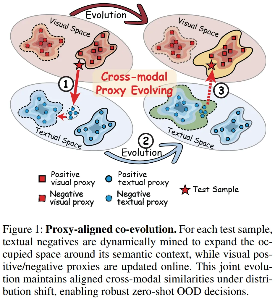 提出CoEvo 框架:首个在测试时构建语义对齐的 ID/OOD 双模态代理缓存,无需训练和标注,仅依赖测试样本动态适配。