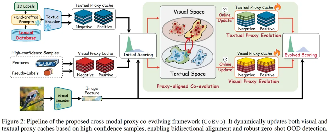 CoEvo是一种测试时零样本 OOD 检测框架,核心包含双模态代理缓存、代理对齐协同进化机制和多模态分数融合三部分,整体流程如图 2 所示。