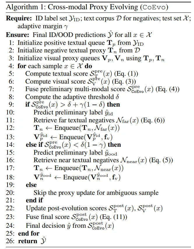 算法1是CoEvo框架的核心执行流程,以“初始化-迭代适配-决策输出”的闭环逻辑,实现零样本OOD检测,全程无需训练和标注,仅依赖测试样本动态优化。流程始于初始化:先从ID标签集生成固定的正文本代理队列,从外部词汇库采样与ID无交集的负标签,构建初始负文本代理队列;再基于和初始化正/负视觉代理队列、,为后续进化奠定基础。核心迭代环节针对每个测试样本展开:首先通过公式(1)和(3)分别计算初始文本分数和视觉分数,按公式(4)融合为初步多模态分数;接着计算自适应阈值,结合置信边际筛选高置信样本——分数高于判定为ID,低于判定为OOD,边际内样本跳过更新;随后ID样本挖掘远语义负文本(公式6)更新,并将视觉特征插入对应队列,OOD样本挖掘近语义负文本(公式5)更新,插入队列。最后,重新计算进化后的文本和视觉分数,按公式(11)融合为最终分数,输出ID/OOD决策。整个流程通过“分数计算-样本筛选-代理更新-分数重算”的循环,实现双模态代理的动态协同进化,保障检测鲁棒性。