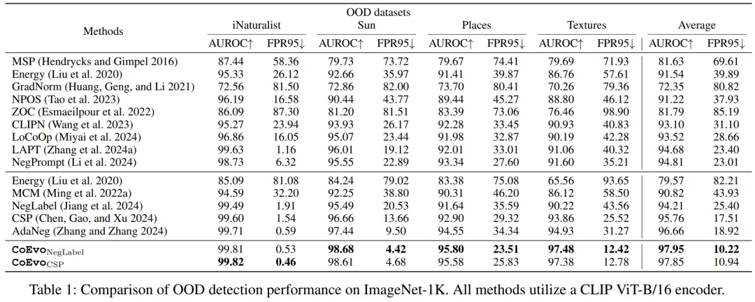 CoEvoNegLabel 平均 FPR95=10.22%,AUROC=97.95%,较最优基线 FPR95 降低 45.98%,AUROC 提升 1.33%;