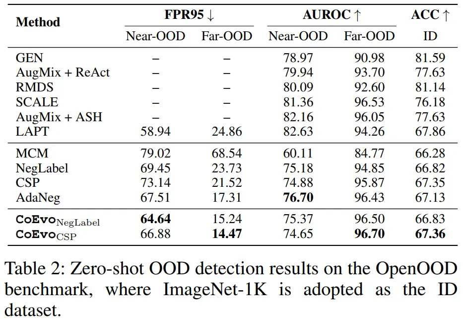 Near-OOD 场景:CoEvoCSP 的 FPR95=66.88%,AUROC=74.65%,略低于 AdaNeg 但保持竞争力;