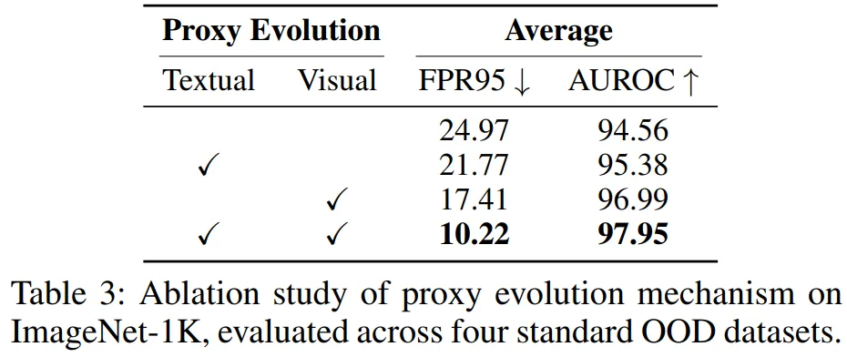 双模态协同进化:FPR95=10.22%,AUROC=97.95%,验证双向适配的必要性。