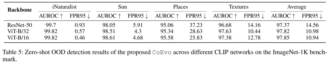 在 4 个 OOD 数据集上均实现最优性能,如 iNaturalist 的 AUROC 达 99.81%,FPR95 仅 0.53%。