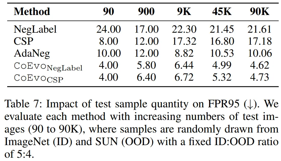 测试集大小:仅 90 个样本时 FPR95=4.00%,随样本量增加性能持续提升,验证动态适配的 scalability。