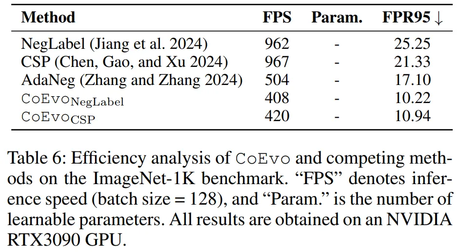 CoEvoNegLabel 的 FPS=408,虽低于 NegLabel(962)和 CSP(967),但显著优于 AdaNeg(504),且性能提升远超效率损失;
