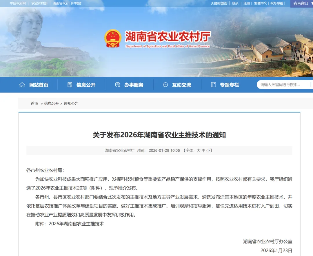 为加快农业科技成果大面积推广应用,发挥科技对粮食等重要农产品稳产保供的支撑作用,按照农业农村部有关要求,我厅组织遴选了2026年农业主推技术20项(附件),现予推介发布。