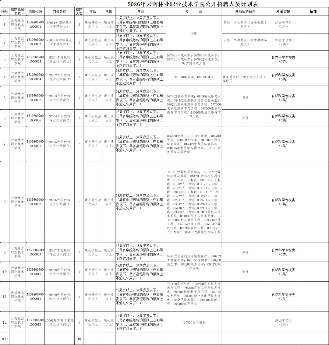 2026年上半年云南林业职业技术学院公开招聘人员16名,具体招聘岗位及招聘条件,详见《2026年云南林业职业技术学院公开招聘人员计划表》(附件1)。