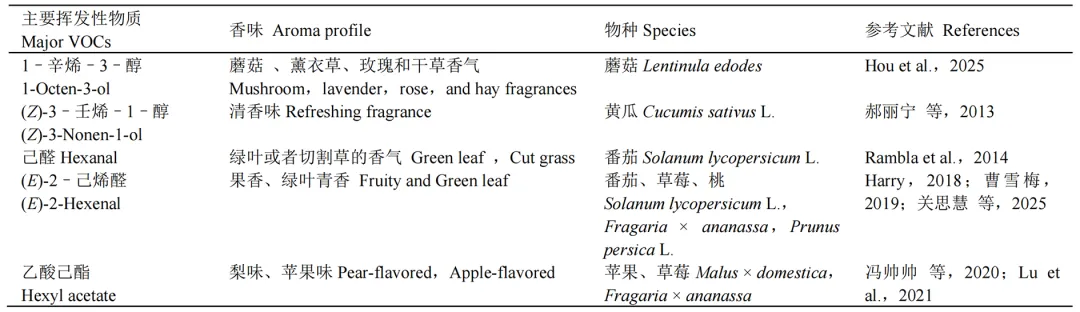 脂肪酸衍生物来源于不饱和C18脂肪酸,亚麻酸和亚油酸。研究表明,植物挥发性脂肪酸衍生物的生物合成主要涉及四条酶促途径,包括脂氧合酶(LOX)、氢过氧化物裂解酶(HPL)、丙二烯氧合酶(AOS)以及乙醇脱氢酶(ADH)。该过程始于脂氧合酶(LOX)催化多不饱和脂肪酸(如亚油酸和亚麻酸)发生区域与立体特异性的氧化,生成9–或13–氢过氧化物中间体。这些中间产物可进入LOX途径的两个分支,进而形成不同的挥发性化合物。其中,丙二烯氧合酶(AOS)特异性作用于13–氢过氧化物,将其转化为不稳定的环氧化物,继而通过环化、还原等反应生成茉莉酸(JA)。相反,氢过氧化物裂解酶(HPL)可裂解9–或13–氢过氧化物,生成挥发性C6或C9醛[如己醛、(E)-2–己烯醛、(E)-2–壬烯醛]并释放相应的氧代酸。这些醛类可进一步作为乙醇脱氢酶(ADH)的底物,被还原生成相应的醇类[如己醇、(Z)-3–己烯醇],并可经酯化反应形成酯类挥发物(Noordermeer et al.,2001;Schwab et al.,2008;Muhlemann et al.,2014)。表3 园艺植物中脂肪酸衍生物