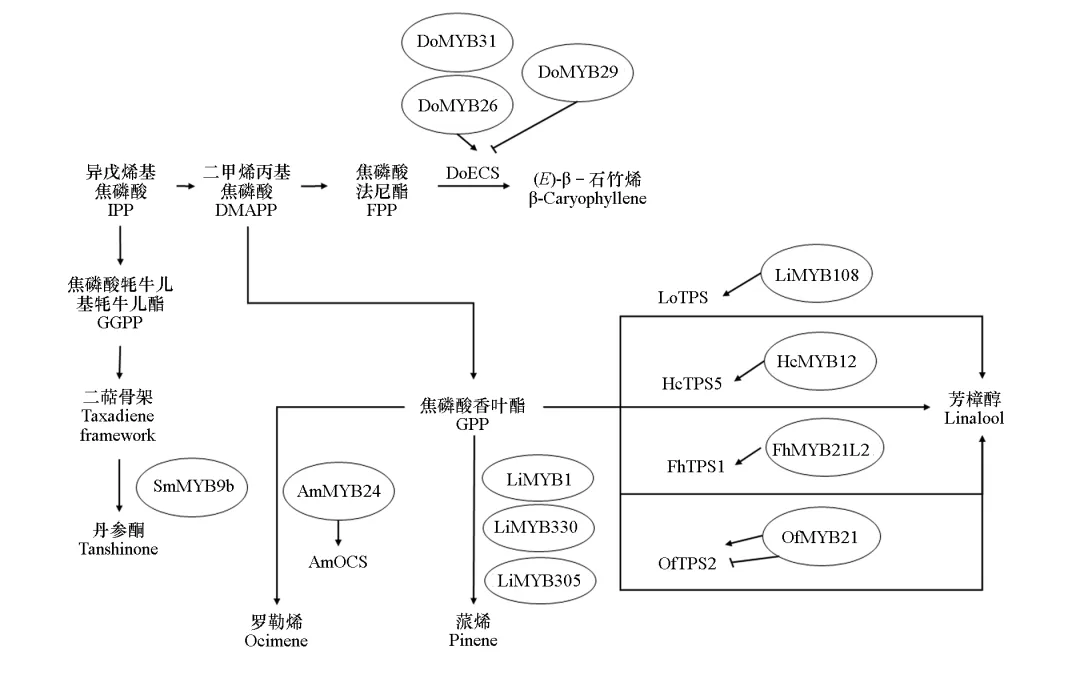 园艺植物芳香化合物的合成受温度、光照、水分、营养元素等环境因素影响。有研究表明MYB转录因子介导光信号对萜烯类芳香化合物合成的调控。当金鱼草(Antirrhinum majus)花朵暴露于蓝光时,激活蓝光受体AmCRY1,AmCRY1可与AmMYB24互作,并与罗勒烯合酶基因AmOCS的启动子结合,共同激活其表达,导致大量罗勒烯的排放(Han et al.,2022)。Yang等(2023)在‘西伯利亚’百合中发现一个受光照诱导表达的LiMYB108,其编码一个R2R3-MYB转录因子,研究发现LiMYB108可与萜烯合成酶基因LoTPS1的启动子结合,直接激活其表达,从而促进光照条件下β-罗勒烯和芳樟醇的合成(Yang et al.,2023)。COP1是一种E3泛素连接酶,在植物光形态建成中作为核心抑制因子,通过泛素—蛋白酶体系统降解光信号通路中的关键转录因子(如HY5),从而抑制光形态建成(Han et al.,2020)。Liu等(2023)在‘西伯利亚’百合中发现LoCOP1可以与LoMYB1和LoMYB3互作,并且在黑暗条件下LoCOP1与LoMYB1和LoMYB3的互作更强,从而负调控黑暗条件下罗勒烯、芳樟醇等花香化合物的合成。MYB转录因子除了参与调控观赏花卉萜类花香化合物的合成外,还参与一些药用植物的萜类活性成分的合成。例如,萜类物质是铁皮石斛(Dendrobium officinaleKimura et Migo)的重要药用成分。Lv等(2022)研究鉴定了调控(E)-β- 石竹烯合成的4个MYB转录因子(DoMYB26、DoMYB29、DoMYB31和DoMYB32),它们主要通过与铁皮石斛编码倍半萜合酶基因DoECS的启动子结合,调控DoECS的表达;其中,DoMYB26和DoMYB31正向调控DoECS的表达,而DoMYB29则负向调控DoECS的表达。丹参(Salvia miltiorrhiza Bunge)是一种具有重要药用价值的植物。在丹参中发现了一个R2R3-MYB转录因子SmMYB9b,属于2R-MYB型转录因子(图1),可以正调控丹参酮的合成;在过表达SmMYB9b的丹参毛状根中,丹参酮的含量比对照提高了2.2倍,其中萜类生物合成基因SmDXS2、SmDXR、SmGGPPS和SmKSL1的表达水平显著上调(Zhang et al.,2017)。图2 MYB转录因子调控园艺植物萜类芳香物质的合成