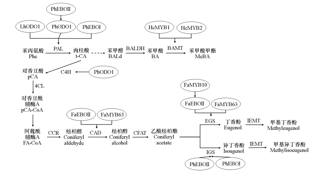 MYB转录因子主要通过调节苯丙素途径中结构基因的表达实现对园艺植物苯丙素类芳香化合物合成的调控(图3)。苯丙素类挥发性物质是矮牵牛(Petunia × hybrida)花香的重要组成成分,已有研究表明,MYB转录因子在调控矮牵牛苯丙素类花香化合物的合成代谢中起重要作用。在矮牵牛中鉴定了一个R2R3型MYB转录因子ODORANT1(PhODO1),PhODO1的表达具有昼夜节律性,其表达模式与花香的释放规律一致,在花香合成增加阶段PhODO1的表达水平上升,在花香释放减少阶段PhODO1的表达水平下降;在PhODO1干扰表达的转基因矮牵牛植株的花中,挥发性苯丙素类化合物的含量显著降低。研究表明,PhODO1可以与正调控莽草酸途径的EPSP(5–磷酸烯醇莽草酸–3–磷酸)合成酶基因的启动子结合,激活该基因的表达,从而影响相关前体物质的合成来影响苯丙素花香化合物合成(Verdonk et al.,2005)。进一步的研究表明,PhODO1是矮牵牛苯丙素类挥发性花香化合物合成的主调控因子,ChIP-seq结果显示它可以与莽草酸途径的DAHPS、EPSPS、CS和苯丙素途径的PAL、C4H、4CL、CCR、CAD和CFAT等基因的启动子结合,进而广泛调控矮牵牛苯丙素类花香化合物的合成和代谢(Boersma et al.,2022)。在百合中鉴定了一个与矮牵牛PhODO1相似的R2R3-MYB转录因子LhODO1。LhODO1在百合花被片中特异表达,将LhODO1转基因到矮牵牛中,能够上调莽草酸途径基因(EPSPS、CS、ADT1)和PAL基因的表达(Yoshida et al.,2018)。在矮牵牛中还发现了另外两个R2R3-MYB转录因子,分别命名为PhEOBI和PhEOBII,它们均属于2R-MYB型转录因子(图1),在调控矮牵牛苯丙素类花香化合物合成的过程中也发挥重要的作用。在沉默PhEOBII表达的矮牵牛花朵中,莽草酸和苯丙素合成途径相关基因CS、CM、PAL2、CFAT、IGS和BPBT的表达水平都下调,导致苯甲醛、苯乙醇、苯甲酸苯甲酯、丁香酚、异丁香酚等花香化合物的合成显著降低;进一步研究发现,PhEOBII可以直接与IGS和PAL基因的启动子结合,激活基因表达(Spitzer-Rimon et al.,2010)。研究还发现PhEOBII不仅在调控矮牵牛花香合成途径中发挥重要作用,而且在花朵从花蕾到开放的转变过程中也发挥关键的作用,在PhEOBII干扰表达的矮牵牛和烟草(Nicotiana attenuata)转基因植株中,花无法进入开放阶段,过早衰老;在干扰表达PhEOBI基因的矮牵牛转基因植株中,苯甲酸甲酯、苯甲酸乙酯、苯甲酸苯甲酯、丁香酚、异丁香酚、苯甲醇等苯丙素类花香化合物的释放量显著降低;进一步研究发现PhEOBI可以与IGS、PAL基因的启动子结合,激活这些基因的表达(Colquhoun et al.,2011)。此外,研究人员还发现上述3个MYB转录因子间也存在互相调控的关系,PhEOBII可以与PhODO1基因的启动子结合激活其表达,PhEOBI也正调控PhODO1基因的表达,在沉默PhEOBI或PhEOBII表达的矮牵牛植株中PhODO1的表达都显著下调,而在干扰表达PhODO1的矮牵牛转基因植株中PhEOBI基因的表达水平升高,这表明它们之间存在复杂的反馈调节机制(Spitzer-Rimon et al.,2012)。MYB转录因子不仅在园艺植物花香化合物的合成中起关键作用,而且在果实的苯丙素类芳香化合物的合成中也发挥重要作用(图3)。如在草莓(Fragaria × ananassa)中鉴定了与矮牵牛PhEOBII同源的MYB转录因子FaEOBII,它也属于2R-MYB型转录因子(图1),发现其调控草莓成熟果实(花托)中丁香酚的合成。沉默FaEOBII表达的草莓花托中,参与丁香酚合成的两个结构基因FaCAD和FaEGS2的表达水平显著下调,草莓果实中的丁香酚含量也显著下降,进一步研究发现FaEOBII可以激活FaCAD基因启动子的活性(Medina-Puche et al.,2015)。此外,研究人员还发现了另一个正调控草莓果实丁香酚合成的MYB转录因子FaMYB10,在干扰FaMYB10基因表达的草莓果实中FaEOBII的基因表达量显著下调,丁香酚的含量也显著降低,另外花青素的含量也显著降低,这说明FaMYB10不仅调控草莓果实芳香物质的合成,而且还调控花青素的合成(Medina-Puche et al.,2014)。Wang等(2022)还鉴定了一个参与草莓果实芳香成分丁香酚合成的R2R3-MYB转录因子FaMYB63,它可以直接与FaEGS1、FaEGS2和FaCAD1基因的启动子结合激活基因的表达,从而正调控丁香酚的合成。研究还发现,FaMYB63不仅参与调控丁香酚合成途径关键酶基因的表达,而且还可以与FaEOBII和FaMYB10的启动子结合激活它们的表达,从而从不同层面调控草莓果实丁香酚的生物合成(Wang et al.,2022)。图3 MYB转录因子调控园艺植物苯环/苯丙素类芳香物质的合成