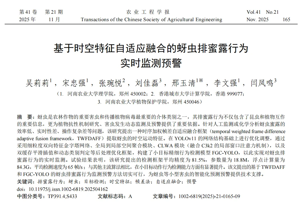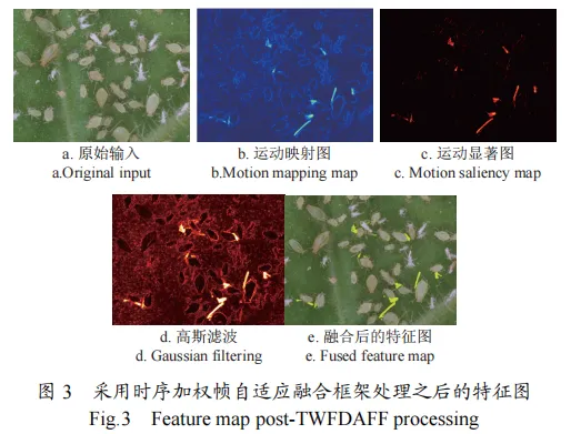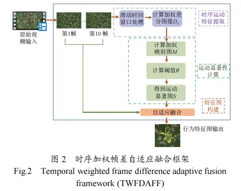 蚜虫是农林作物的重要害虫和传播植物病毒最重要的介体类别之一,其排蜜露行为不仅包含了昆虫和植物互作的重要信息,更为植物抗性机制研究、害虫发生动态监测及预警提供了重要依据。针对人工监测或化学分析蚜虫蜜露的效率低、实时性差、操作复杂差等问题,该研究提出一种时序加权帧差自适应融合框架(temporal weighted frame difference adaptive fusion framework,TWFDAFF)提取蚜虫的时空运动特征。