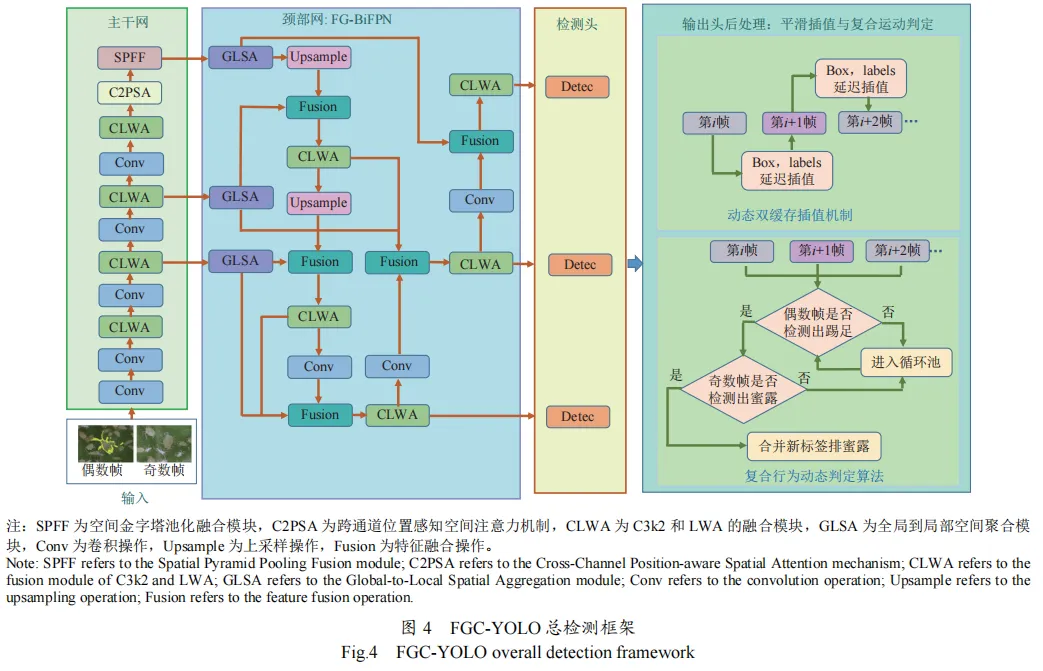 在YOLOv11的网络结构基础上进行优化调整,通过采用细粒度双向特征金字塔网络、全局到局部空间聚合模块、CLWA模块(融合C3k2的局部窗口注意力机制),以及双缓存平滑插值和动态类别判定等后处理优化框架,构建了小目标精细行为检测模型FGC-YOLO,以此实现对蚜虫排蜜露行为的实时监测。