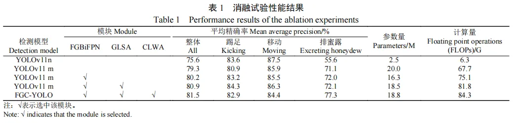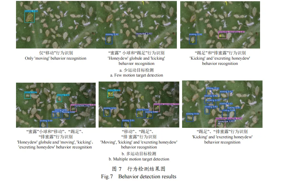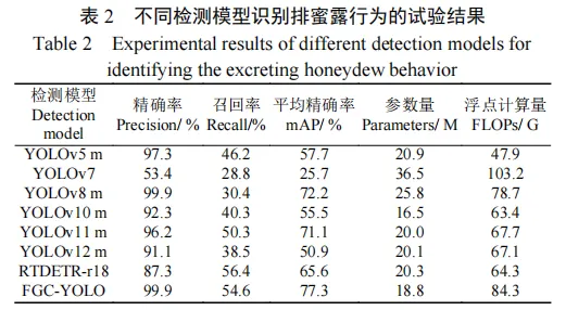 试验结果表明,该研究提出的检测框架平均精度为81.5%,参数量为18.8M,浮点计算量为84.3G,平均检测速度为65帧/s ;与其他主流算法相比,在小目标动作行为检测能力方面有显著提升。该文提出的基于TWFDAFF和FGC-YOLO的蚜虫排蜜露行为监测预警方法切实可行,为蚜虫等小型害虫的智能化预测预警提供技术支撑。
