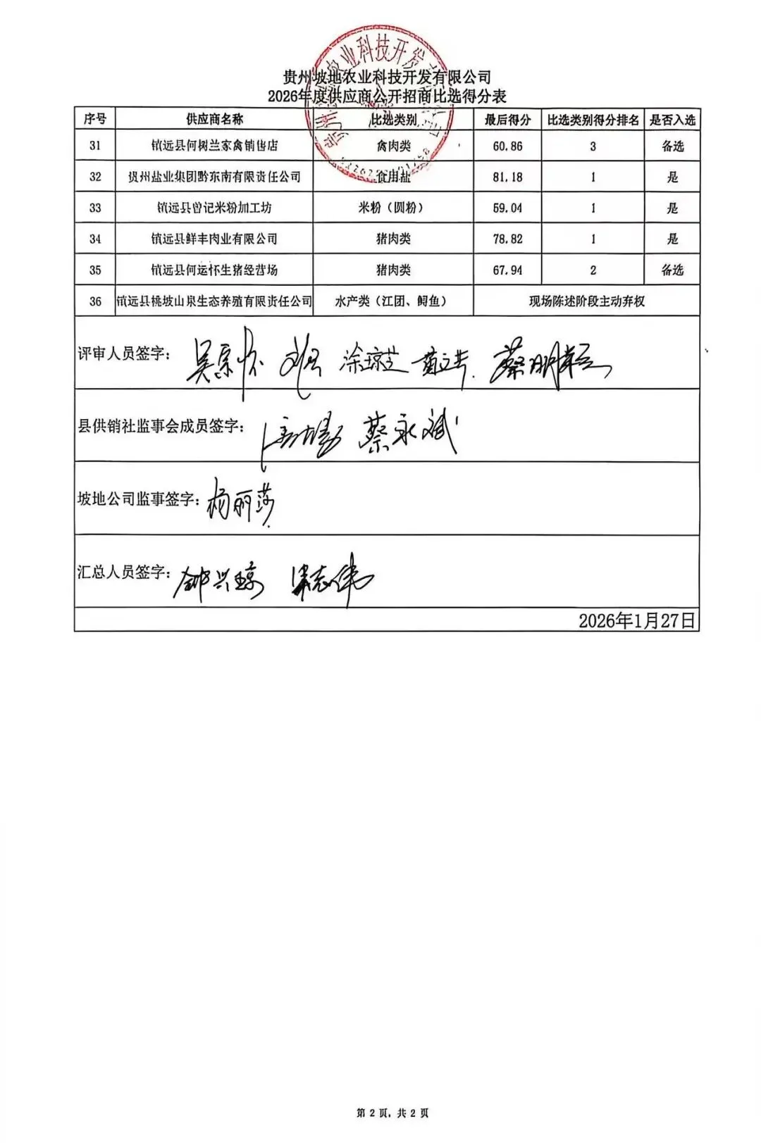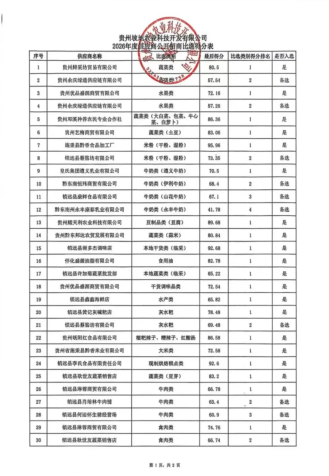 根据《贵州坡地农业科技开发有限公司镇远县中小学、幼儿园学生食堂食品原材料招商公告》流程,现将2026年度供应商公开招商比选得分进行公示。