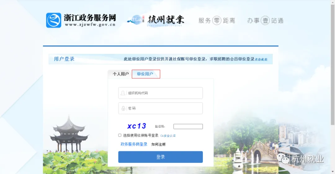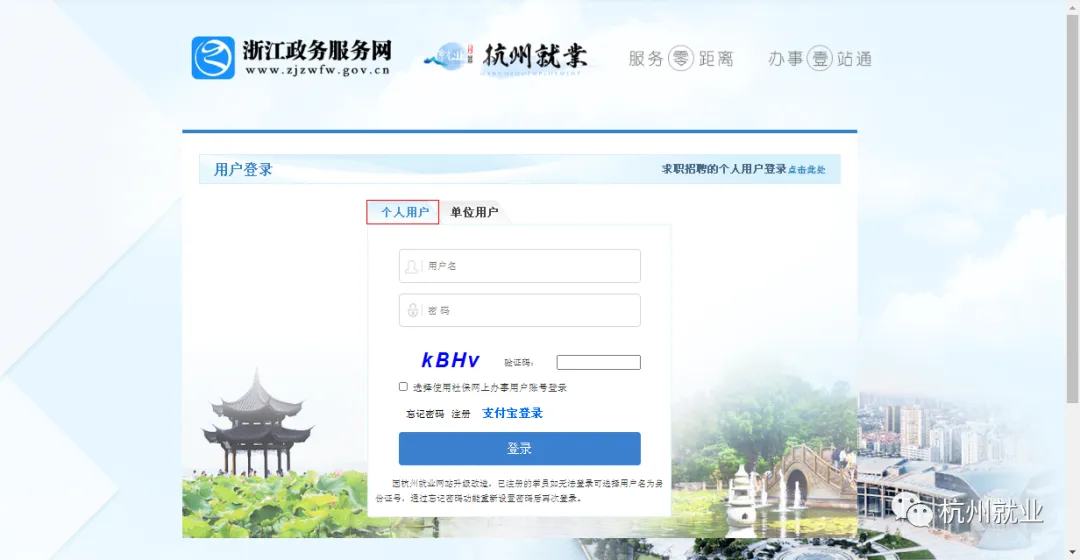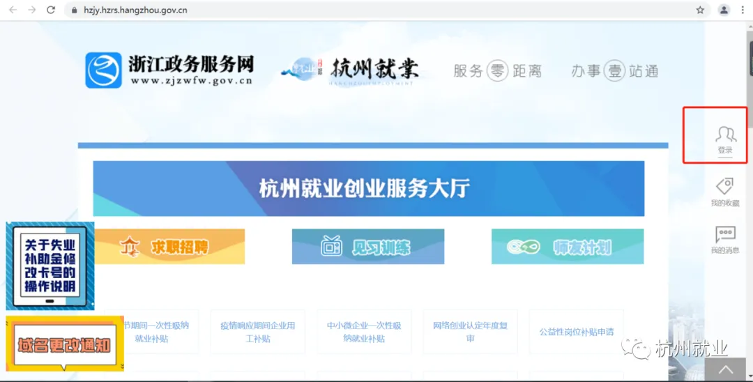 2.进入“杭州就业创业服务大厅”界面,在右侧点击登录后,跳转登录页面。