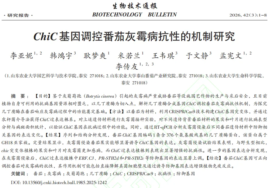 近日,山东农业大学李传友团队在《生物技术通报》发表了题为《ChiC基因调控番茄灰霉病抗性的机制研究》的文章。本研究拟在番茄中通过遗传转化验证几丁质酶基因ChiC的功能,揭示植物对灰霉菌等坏死型病原的抗性机制,为培育具有持久抗性的新型作物品种提供理论基础和基因资源。
