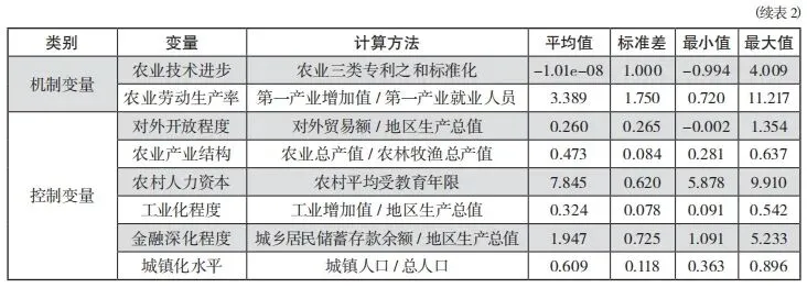 研究的中介变量为农业技术进步与农业劳动生产率。农业技术进步,参考张金鑫(2020)的做法,采用农业三类专利之和进行衡量,为消除量纲的影响,测算后用标准化的方式进行处理;农业劳动生产率,参考郭少华的做法,使用第一产业的增加值/第一产业就业人员来衡量。