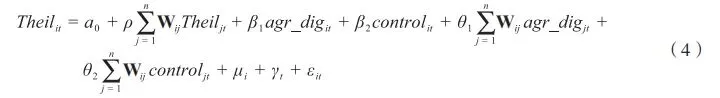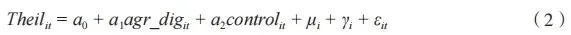 其中,Theilit代表省份i在t年的城乡收入差距,agr_digit代表代表省份i在t年的农业数字化水平,controlit为控制变量,a0为常数项,a1为解释变量系数,即农业数字化对城乡收入的影响效应,若a1显著为负,则农业数字化能够缩小城乡居民收入差距;μi代表个体固定效应,γi为时间固定效应,εit表示随机扰动项。