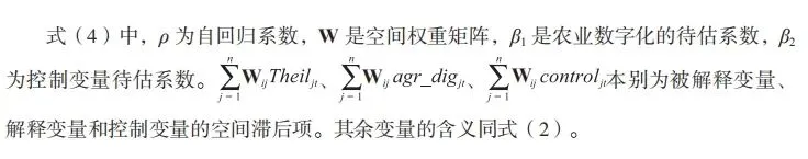 地理相邻或经济相近的地区间往往存在技术溢出、要素流动及政策联动等空间交互作用。进而导致本地区的农业数字化不仅影响本地城乡收入结构,还可能作用于邻近地区的城乡收入差距。鉴于此,研究构建基于空间邻接矩阵的空间杜宾模型(SDM),利用模型分析农业数字化对城乡收入差距的空间溢出效应。研究设定的空间杜宾计量模型(SDM)的基本公式为: