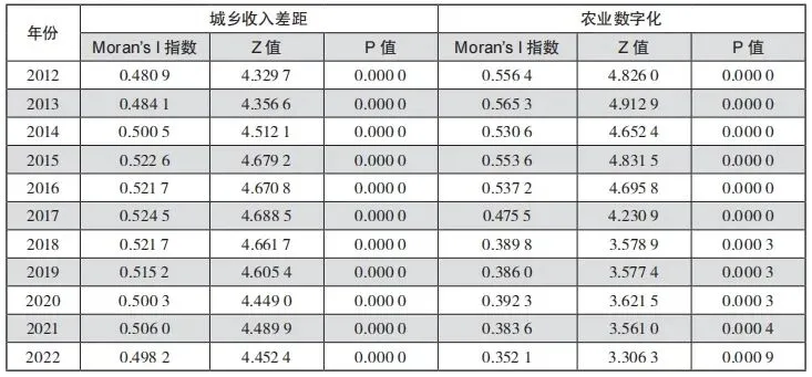 表8 农业数字化和城乡收入差距的全局Moran’s l指数