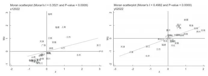图2 2022年农业数字化水平(左)和城乡收入差距(右)的全局Moran’s l散点图