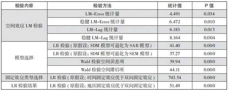 为选择适宜的空间计量模型,研究在采用空间计量回归模型前先开展了系列适用性检验。首先,由表9可见,空间效应LM检验的四个统计量均通过显著性检验,其中稳健LM-Error与稳健LM-Lag的统计量在1%水平上显著,LM-Error和LM-Lag统计量也通过了5%水平上的检验。这表明研究对象同时存在空间误差效应与空间滞后效应,由此可以推断空间杜宾模型的选择为最优选择。其次,LR统计量与Wald检验在1%水平上均拒绝了空间杜宾模型(SDM)可简化为空间误差模型(SEM)或者空间自回归模型(SAR)的原假设,进一步印证空间杜宾模型的最优性。最后,LR检验结果表明,“时间固定效应优于双向固定效应”及“地区固定效应优于双向固定效应”的原假设均在1%显著性水平下被推翻。由于模型检验中拒绝原假设所得结论可信度较高,因此研究最终选用双向固定效应的空间杜宾模型。