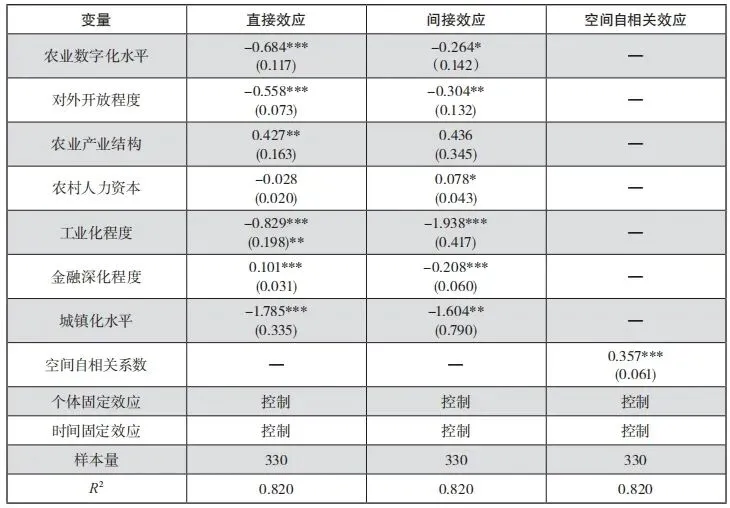 在控制变量方面,城镇化水平与工业化程度对城乡收入差距呈显著的负向影响,推动了本地区及邻近地区收入差距的缩小。农业产业结构对本地区城乡收入差距的影响较小,未能显著影响收入差距,可能是因为该变量的作用机制较为间接,或尚未在模型中完全显现。金融深化程度与对外开放程度在本地区的影响未达到显著水平。金融深化对收入差距的影响较为复杂,尚未在当前模型中体现出明确的效果;而对外开放程度则对邻近地区呈现一定的空间溢出效应,表明对外开放可能在其他省份加剧了收入差距。