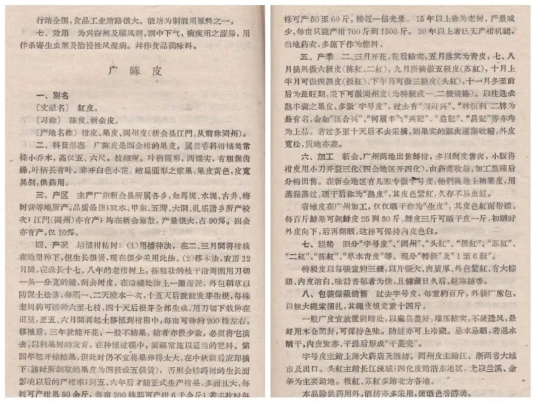 新会陈皮产季。“七、八月摘果做六级皮(拣红、二红),九月所摘做五级皮(苏红),十月份上半月可做四级皮(极红),下半月可做三级皮(头红),十一月冬至前后为最旺期,采下可做冈州皮(为特级或一、二级规格)。以往选成熟丰满之果皮,多做‘字号皮’,有‘刘财兴’‘林恒利’二牌为最有名,余如‘伍合兴’‘何履丰’‘兴记’‘益记’‘昌记’等亦均为上品。”