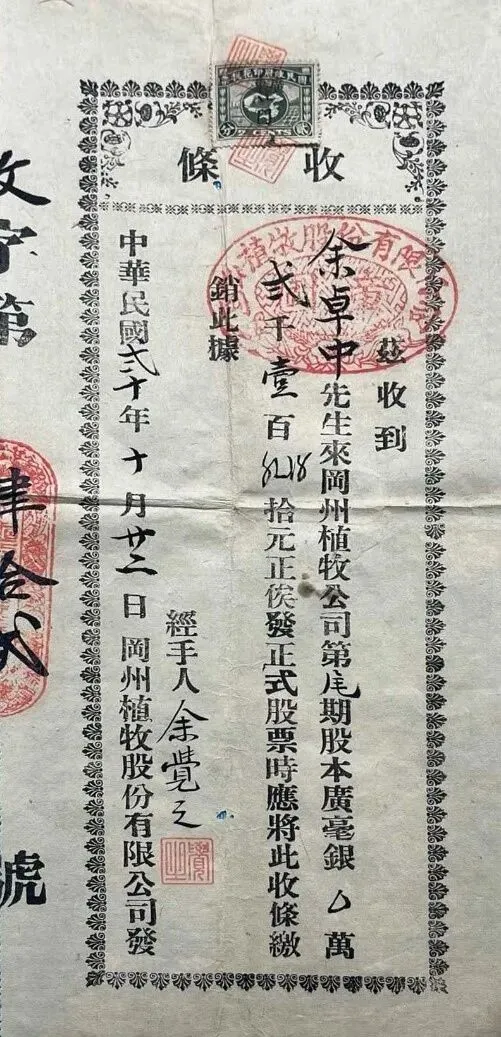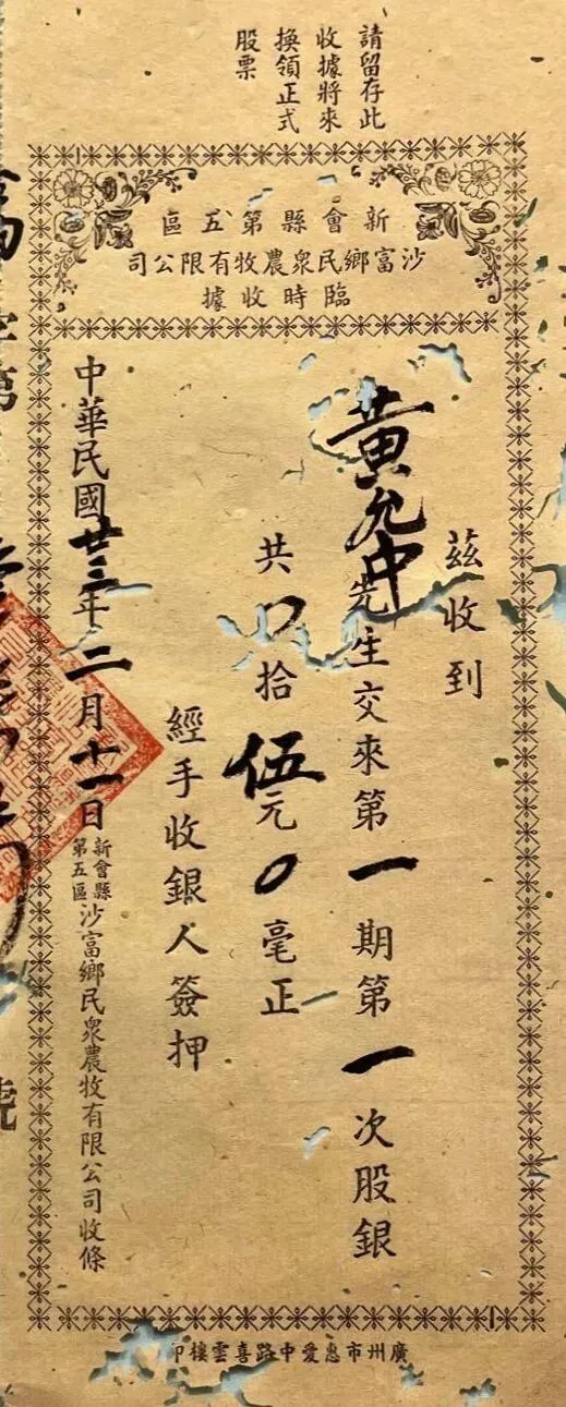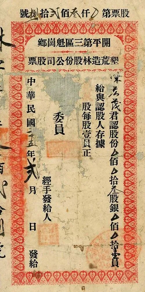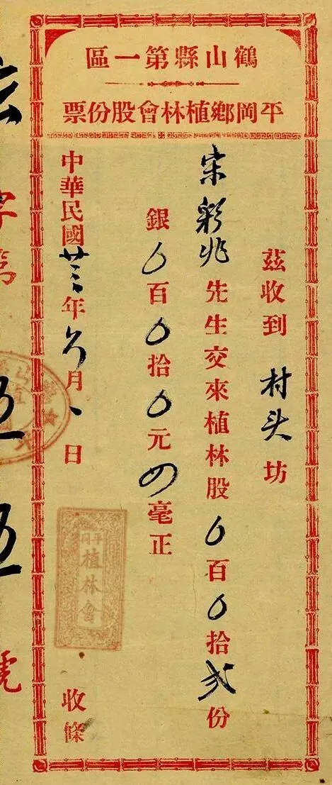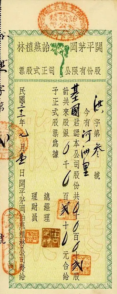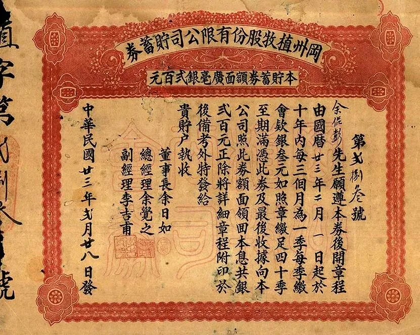 民国23年江门纸厂冈州植牧股份有限公司储蓄券