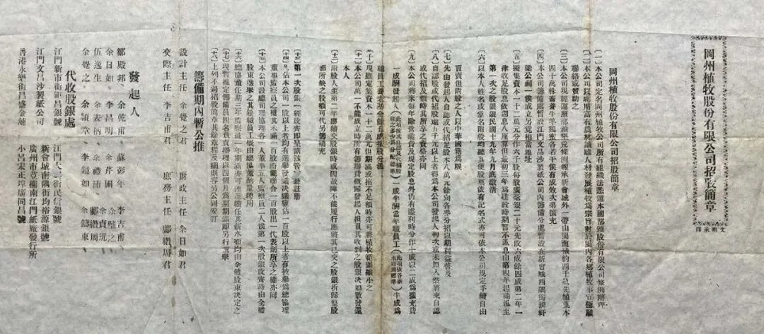 公司租用新会城一带山岗荒地,首期面积4000亩,种植果木40万棵,林下蓄养牛、羊、鸡、蜜。为筹集资金,公司在江门新市街钜昌银号、新会城南隅街均裕银号、香港永乐街昌盛金铺、小吕宋正埠广同昌号设立招股办事处,发行股票6000股,募集资金12万元。后期,冈州植牧股份有限公司扩大经营,再向大泽及银盏坳(地名)一带租地,开垦植树。