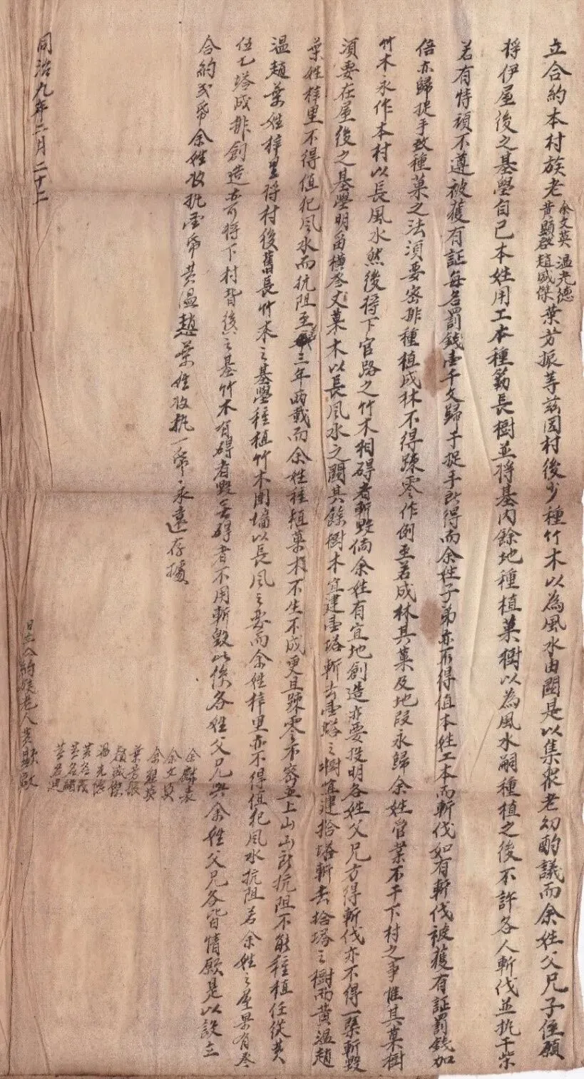 同治9年,古井镇石冲苑(石苑村)族老余文英、余麟表、余垦英、温光德、黄显启、黄名茂、黄名绪、黄名迪、赵盛杰、叶芳振5姓10人(石苑有:李、黄、余、赵、叶、温、梁、苏、刘共9姓),就村后“风水林”保护召集村民集议后,立下村规乡约:划定风水林林地范围自村落民屋后环山沟至莲花山山坡地,部分林地是余姓父兄子侄自愿献出;林地种簕竹、种大树及果木,永作本村风水林。风水林工本费由余姓人自种自付,竹木、果树永归余姓人所有。风水林不许自行砍伐,不许执拾干柴。如有村民、或余姓人违反村规,罚钱一千文归捉手。