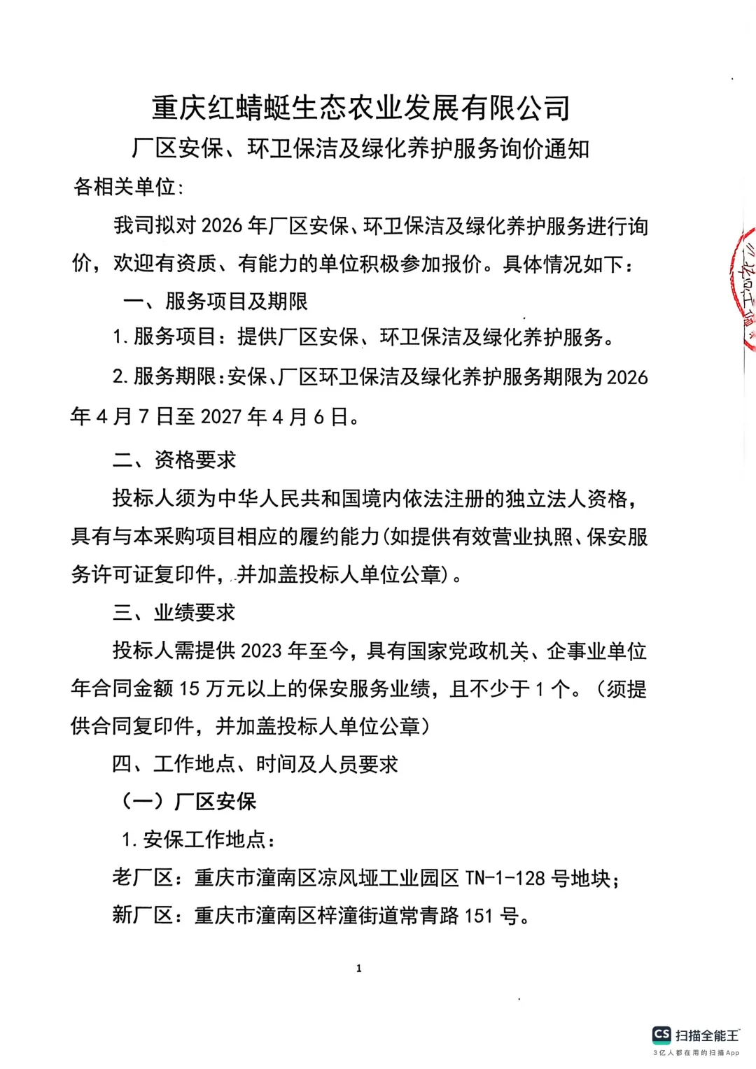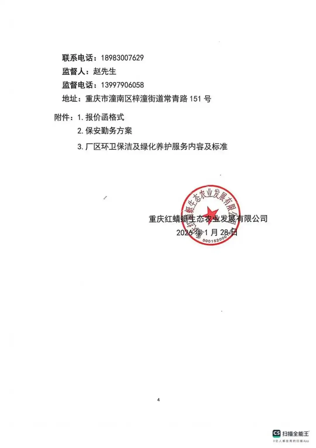 重庆红蜻蜓生态农业发展有限公司厂区安保、环卫保洁及绿化养护服务询价通知