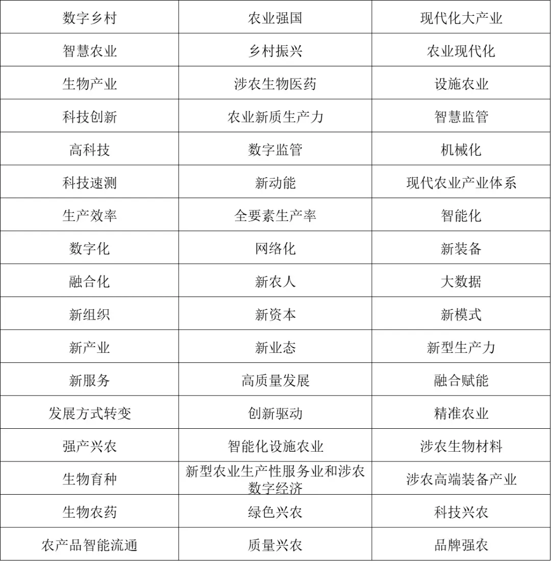 4、最终词表:经过语义扩展与人工校验,最终识别出96个高频且与农业新质生产力高度相关的词汇,构成衡量农业新质生产力的词汇库
