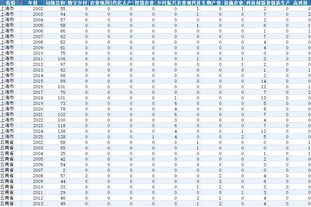 本数据基于2002-2025年各省政府工作报告中关于农业新质生产力相关词汇的词频统计与语义扩展,结合深度学习方法识别高相关词汇,并对区域间与年份间的变化进行量化处理,最终得到省级和地级市新质生产力数据,该数据可用于分析区域农业转型轨迹、科技赋能程度与政策导向的关系等