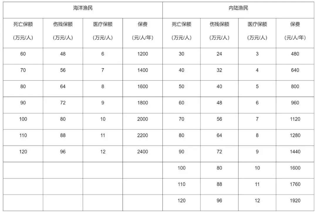 1.渔民人身意外伤害保险、雇主责任保险:按作业区域分为海洋渔民和内陆渔民。海洋渔民保额最低60万元,最高120万元,费率0.2%。内陆渔民保额最低30万元,最高120万元,费率0.16%。伤残保额为死亡限额的80%,意外医疗保额为死亡限额的10%。具体保额和保费档次如下: