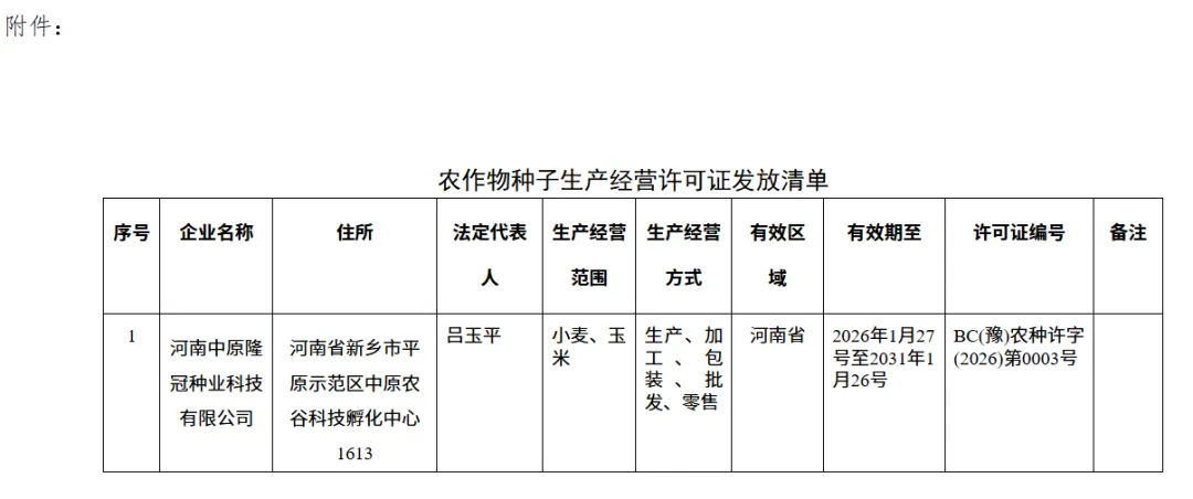 依据《中华人民共和国种子法》《农作物种子生产经营许可管理办法》等有关规定,批准发放河南中原隆冠种业科技有限公司《农作物种子生产经营许可证》,详见附件。