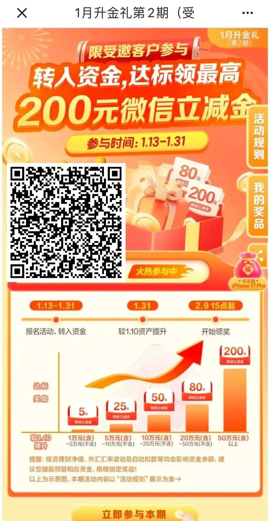 活动内容:活动期间,受邀用户先报名,后在1月31日前完成资产提升(1月31日日终资产较1月10日日终资产提升),即可获得对应金额的微信立减金,最高200元。