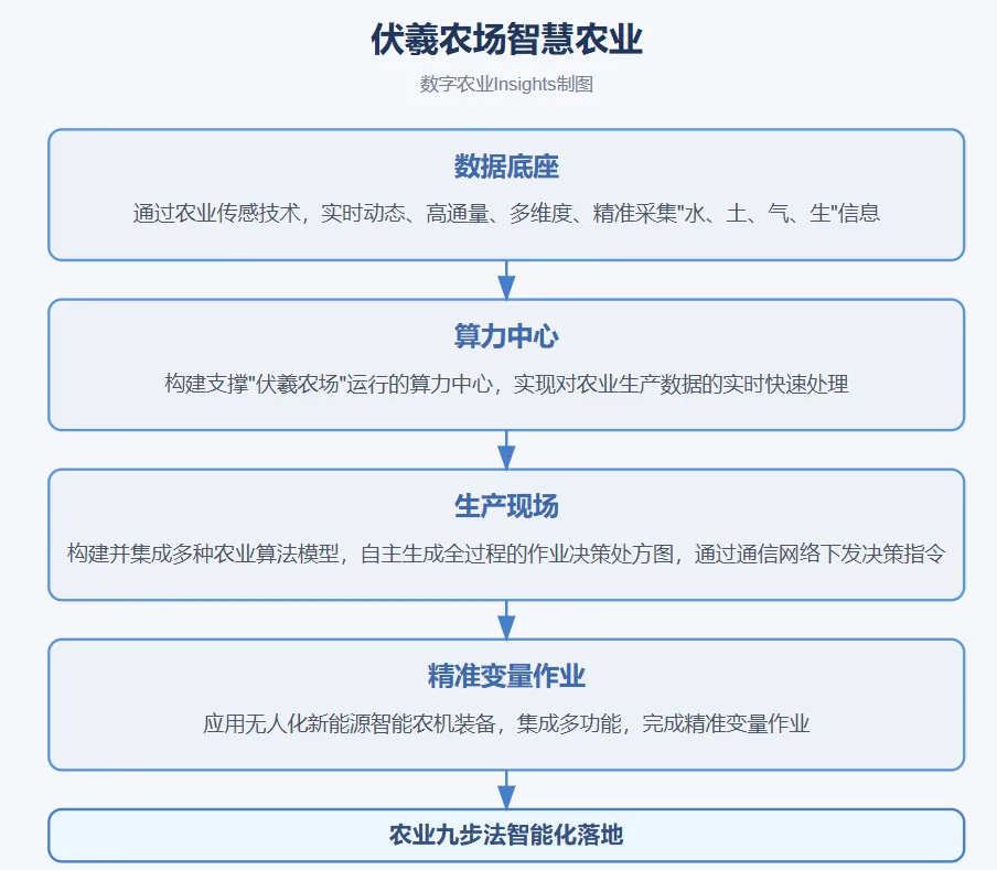 为此,“伏羲农场”首先要通过农业传感技术,实时动态、高通量、多维度、精准采集涉及农业生产全过程的“水、土、气、生”信息,建立数据底座;然后,构建支撑“伏羲农场”运行的算力中心,实现对农业生产数据的实时快速处理;依托“伏羲农场”数据底座,构建并集成多种农业算法模型,自主生成包含种植前、种植中、种植后全过程的作业决策处方图,并通过通信网络将决策指令下发到“伏羲农场”生产现场;随后,依托第3代智能农机技术体系,应用无人化新能源智能农机装备,集成无人驾驶、路径规划、自动避障、作业质量监控等功能,完成精准变量作业。最终实现“农业九步法”(精准整地、精量播种、变量施肥、变量施药、变量施水、收获减损、运输减损、仓储减损、秸秆综合利用)的智能化落地,全面打造高质量的农业现代化生产模式。