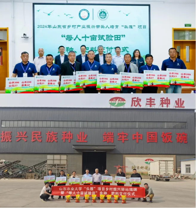 为深入贯彻落实国家“藏粮于地、藏粮于技”战略,推动山东省乡村振兴与种业振兴行动,学校依托“头雁”项目,结合山东省乡村振兴示范片区建设,打造“每人十亩试验田”孵化式培养模式,投入20万元经费,为三届乡村振兴示范片区“头雁”及2024级全体学员购置258袋“山农386”玉米种、9030袋“山农209”糯玉米种、7740斤“山花27号”花生种、3090斤“嘉黄32”大豆种等最新品种,在学员试验田设立良种对比试验区,供学员试种;投入15万元经费,为“头雁”发放农大集团最新叶面肥411箱、水溶肥195箱,导师帮扶团队全程指导精准施肥与高效种植技术应用。