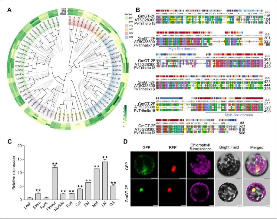 大豆中的三螺旋转录因子家族共包含71个成员,系统发育分析将其归入六个亚家族,其中GmGT-2F(Glyma.03G246000)属于GT-2亚家族。保守基序分析显示,GT-2亚家族拥有一个可能决定其功能特异性的独特基序(Motif 4)。共线性分析揭示了GmGT-2F与GmGT-2B、GmGT-2R和GmGT-2V等成员间存在紧密的遗传关系,其蛋白序列,特别是在N端和C端的Myb样DNA结合域高度保守。对GmGT-2F启动子区域的分析鉴定出多种与光、激素及胁迫响应相关的顺式作用元件。基因表达分析表明,GmGT-2F在花以及种子发育的中后期阶段表达水平显著升高。亚细胞定位实验证实,GmGT-2F蛋白定位于细胞核内,这与其作为转录因子的功能相符 (Fig. 1)。