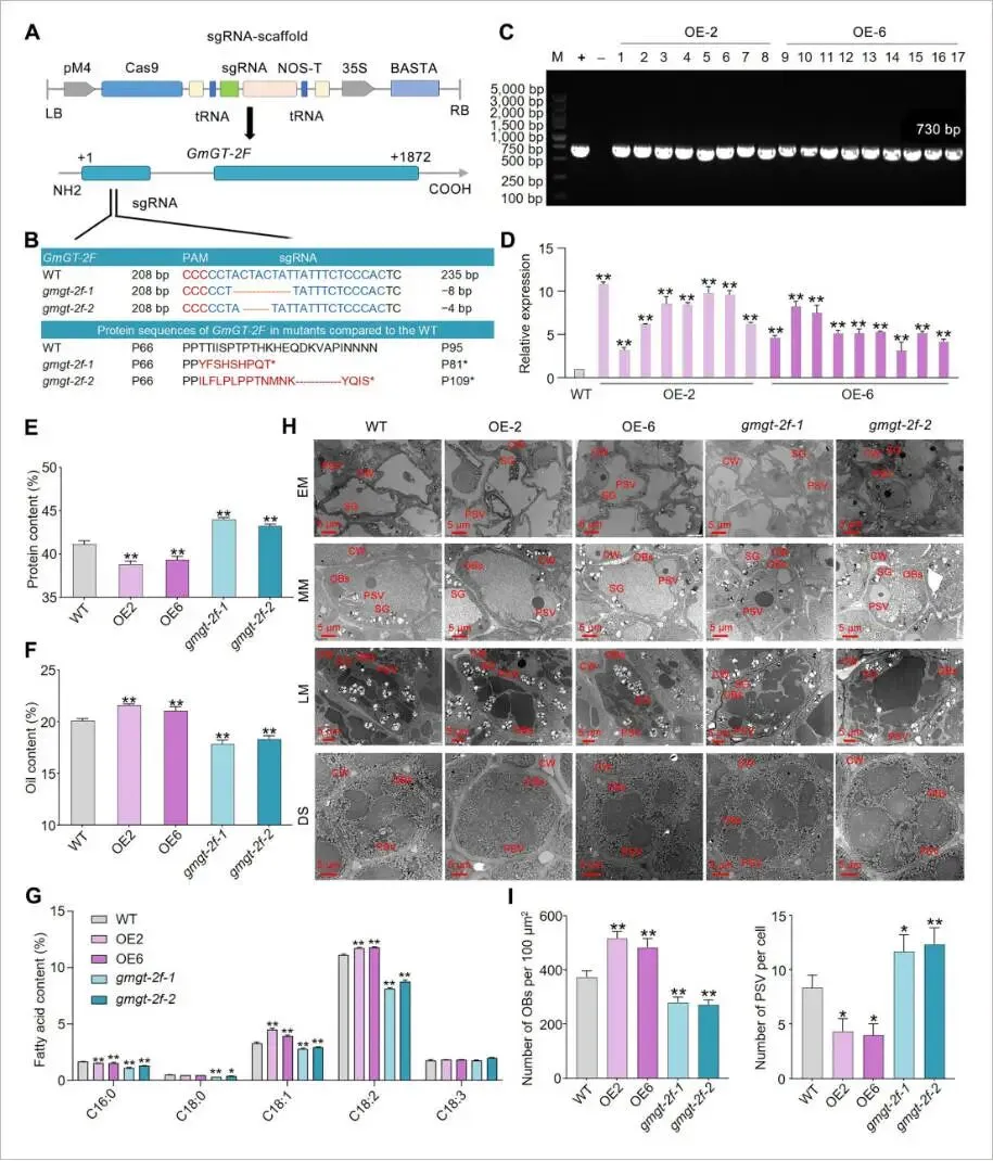 为探究GmGT-2F的功能,利用CRISPR-Cas9技术创制了其敲除突变体(gmgt-2f-cr),并构建了过表达株系(GmGT-2F-OE)。表型分析显示,与野生型(WT)相比,GmGT-2F-OE株系的种子蛋白含量显著降低,而gmgt-2f-cr株系的蛋白含量则显著升高,表明GmGT-2F对种子蛋白含量起负向调控作用。相反地,油含量分析结果显示,GmGT-2F-OE株系的油含量显著增加了4.71%–7.37%,而gmgt-2f-cr株系则显著降低了8.76%–11.11%,证实GmGT-2F是种子油分积累的主要正向调控因子。进一步的脂肪酸组分分析发现,GmGT-2F过表达能显著提高油酸(C18:1)和亚油酸(C18:2)的含量。透射电镜观察揭示,在成熟种子中,GmGT-2F-OE株系的油体(OBs)数量显著增多,而蛋白储藏泡(PSVs)数量减少;gmgt-2f-cr株系则呈现相反的表型。这些结果共同证实,GmGT-2F作为油含量的正调控因子和蛋白含量的负调控因子,调控着种子中两者的平衡 (Fig. 2)。
