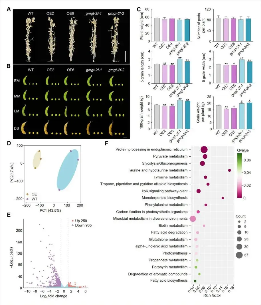 图3. 野生型(WT)、GmGT-2F-OE和gmgt-2f株系的产量性状分析及OE-6与WT成熟种子的转录组分析(A) WT、GmGT-2F-OE和gmgt-2f株系整株植物的表型比较。比例尺 = 10 cm。(B) 多个发育阶段的豆荚和种子形态。比例尺 = 1 cm。(C) WT和转基因株系中株高、单株荚数、种子长度、种子宽度和百粒重的定量。数据表示为平均值±标准误(n = 8)。星号表示与WT相比的显著差异(学生t检验:* P < 0.05, ** P < 0.01)。(D) 比较OE-6和WT成熟种子的RNA-seq数据的主成分分析(PCA)。(E) 展示OE-6和WT样本间差异表达基因(DEGs)的火山图。(F) OE-6和WT植株间DEGs的KEGG通路富集分析。