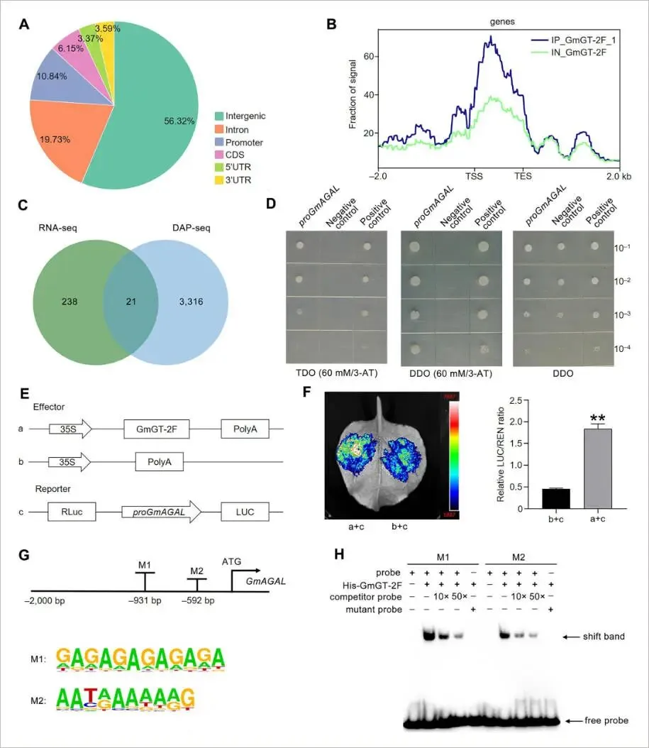 图4. GmGT-2F直接结合GmAGAL启动子并激活其转录(A) DAP-seq鉴定的GmGT-2F结合峰在基因组特征上的分布。(B) 显示以转录起始位点(TSS)和转录区域为中心的GmGT-2F结合峰分布的元图。(C) 展示RNA-seq上调的差异表达基因(DEGs)与DAP-seq鉴定基因之间重叠的维恩图。(D) 酵母单杂交(Y1H)实验证实GmGT-2F与GmAGAL启动子的结合。转化子在补充有3-AT的TDO培养基上进行筛选。pGADT7空载体作为阴性对照。DDO: SD/–Leu/–Trp; TDO: SD/–Leu/–Trp/–His。(E) 双荧光素酶报告实验中所用构建体的示意图。(F) 在本氏烟草叶片中显示GmGT-2F对GmAGAL启动子转录激活作用的双荧光素酶报告实验。数据表示为平均值±标准误(n = 4)。星号表示显著差异(学生t检验:** P < 0.01)。(G) 用于电泳迁移率变动分析(EMSA)的GmAGAL启动子区域示意图。预测的GmGT-2F结合位点(M1和M2)已标出。富集的结合基序的DNA logos使用HOMER生成。(H) EMSA证实重组GmGT-2F与生物素标记的GmAGAL启动子探针的直接结合。结合特异性通过使用未标记的竞争探针和缺少GmGT-2F结合基序的突变探针进行验证。