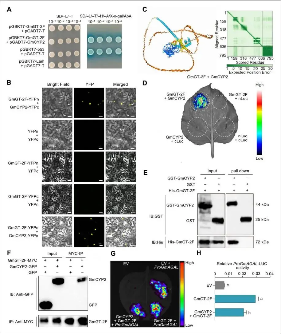 图6. GmGT-2F与GmCYP2发生物理互作(A) 酵母双杂交(Y2H)实验证明GmGT-2F与GmCYP2在酵母细胞中互作。(B) 使用AlphaFold3模型预测的GmGT-2F与GmCYP2的互作。(C) 双分子荧光互补(BiFC)实验证实在本氏烟草表皮细胞中GmGT-2F与GmCYP2的互作。GmGT-2F和GmCYP2分别克隆到nYFP和cYFP融合载体中。比例尺 = 20 μm。(D) 荧光素酶互补成像(LCI)实验显示GmGT-2F与GmCYP2的互作。GmGT-2F-nLUC和cLUC–GmCYP2构建体在本氏烟草叶片中共表达。比例尺 = 1 cm。(E) Pull-down实验证实GmGT-2F-His与GmCYP2–GST之间的互作。使用抗GST和抗His抗体检测免疫沉淀的蛋白。(F) Co-IP实验显示GmGT-2F与GmCYP2在本氏烟草叶片中的互作。输入和沉淀的蛋白通过抗GFP或抗MYC抗体进行免疫印迹分析。(G) 烟草叶片中的瞬时表达实验,显示共表达GmCYP2对GmGT-2F介导的GmAGAL启动子激活的影响。(H) (G)中实验的定量发光分析,n = 4。小写字母表示显著差异(单因素方差分析(ANOVA)检验)。