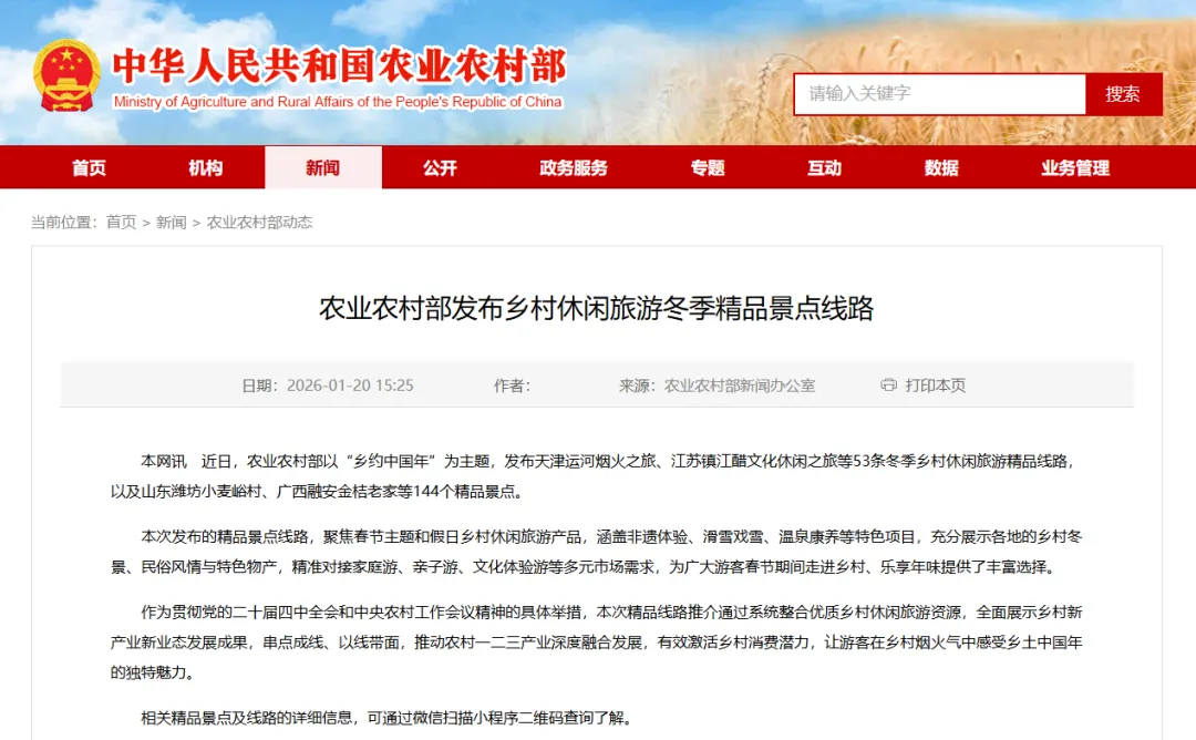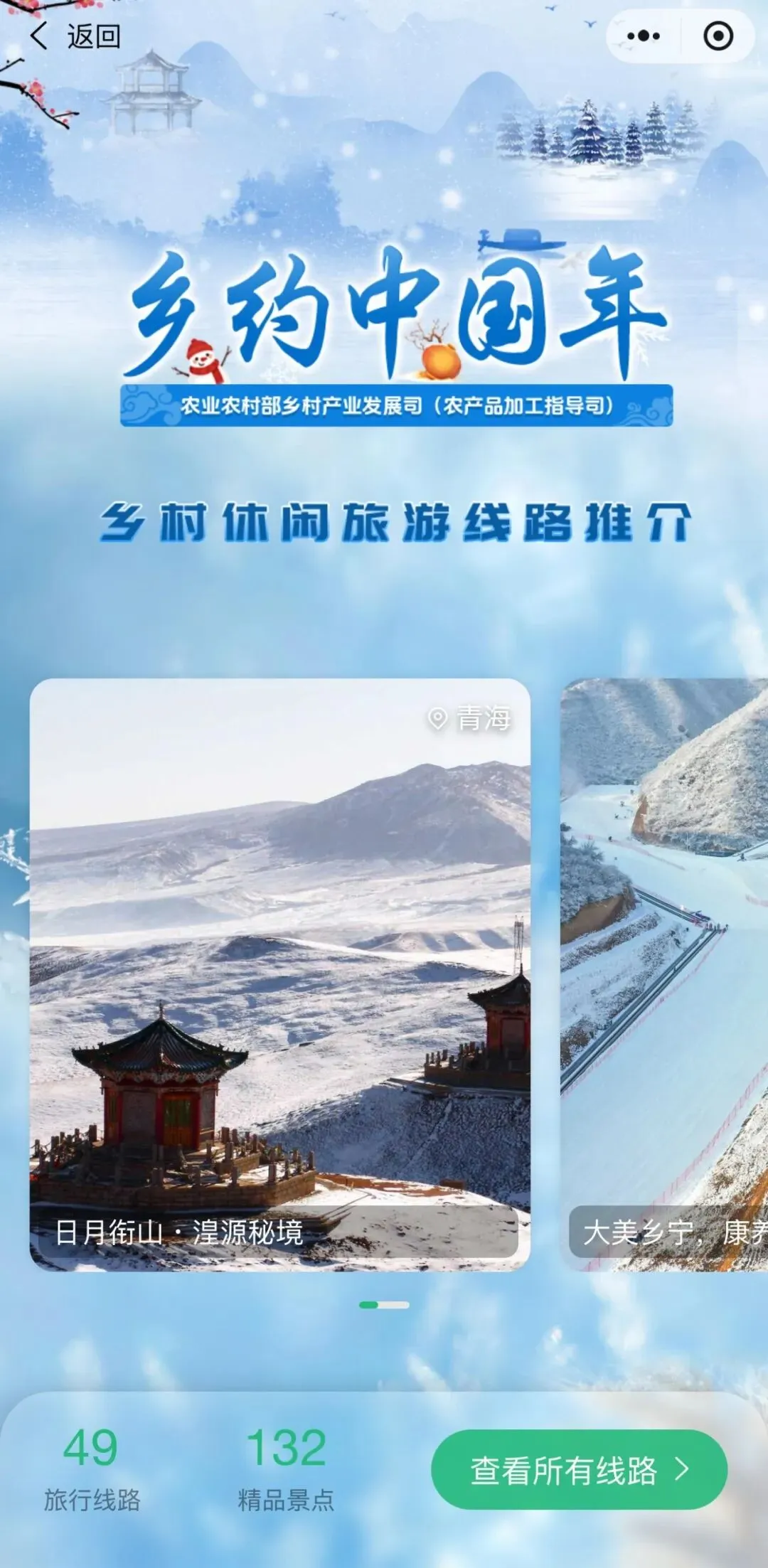 近日,农业农村部以“乡约中国年”为主题,发布53条冬季乡村休闲旅游精品线路以及144个精品景点。