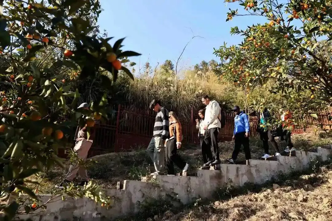 ▲广西柳州市融安县大将镇才妙村“金桔老家”,留学生们了解金桔种植历史。(谭凯兴 摄)