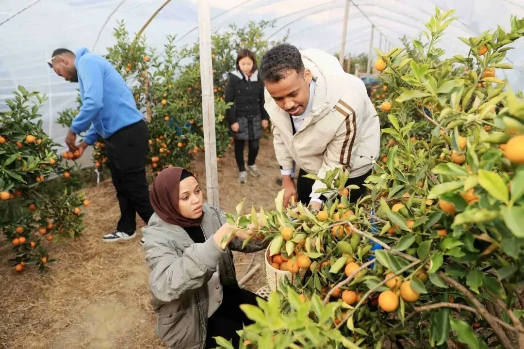 ▲在广西柳州市融安县大将镇东潭村大潭屯,北京外国语大学留学生在体验金桔采摘。(谭凯兴 摄)