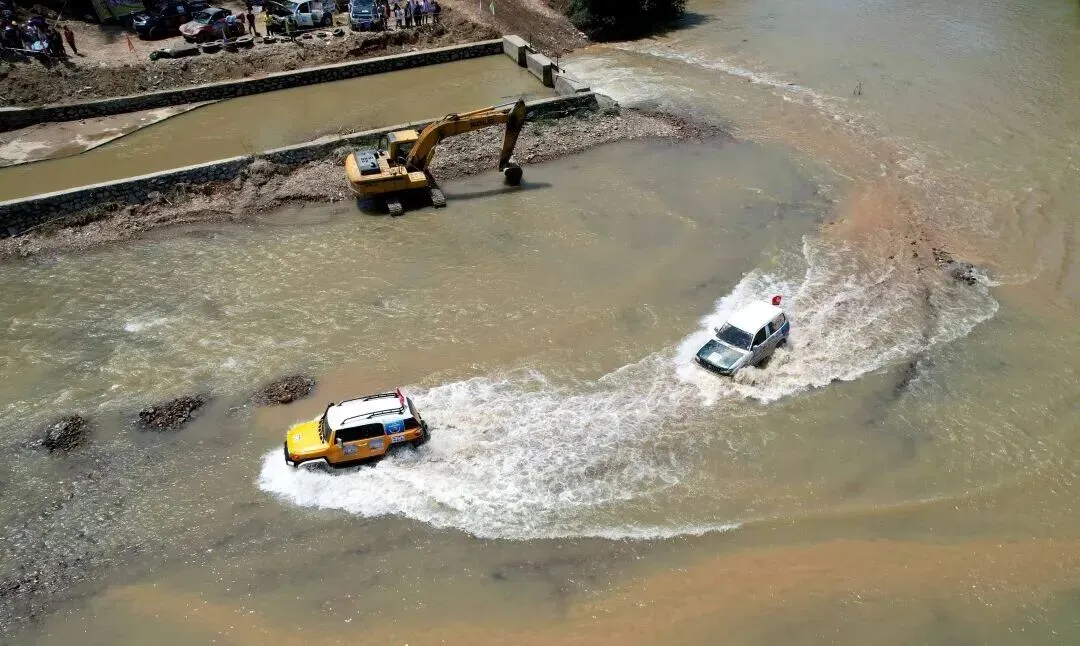 ▲参赛选手驾驶越野汽车在广西柳州市融安县大将镇东潭村大潭屯河道上角逐。(无人机图片,谭凯兴 摄)