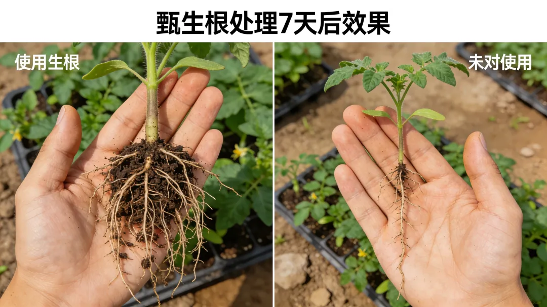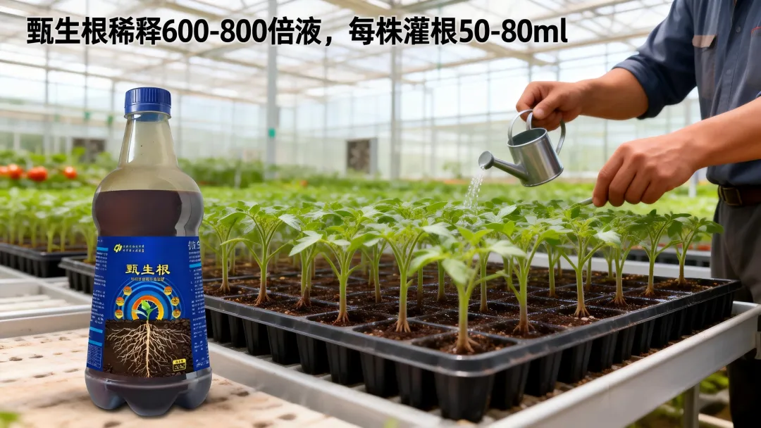 ,稀释800-1000倍。这样做的好处是能加速新根生成,缩短缓苗期。一般情况下,不加生根剂的番茄,缓苗期要7-10天;加了甄生根之后,5-7天就能恢复生长,时间上能提前3-5天。