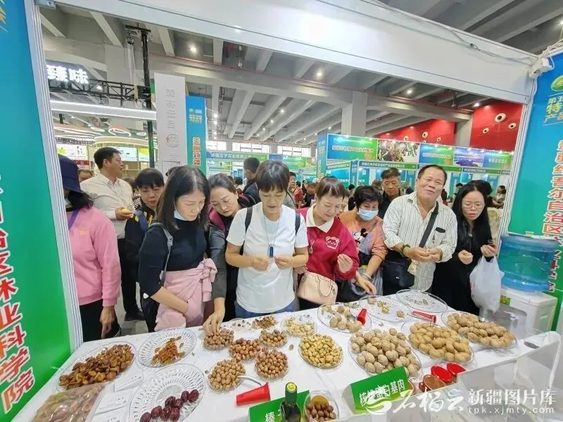 在2025年11月14日举办的第五届中国新疆特色林果产品博览会上,自治区林业科学院展位上展示了众多沙漠产业产品,吸引了广州市民关注。图片由自治区林业科学院提供